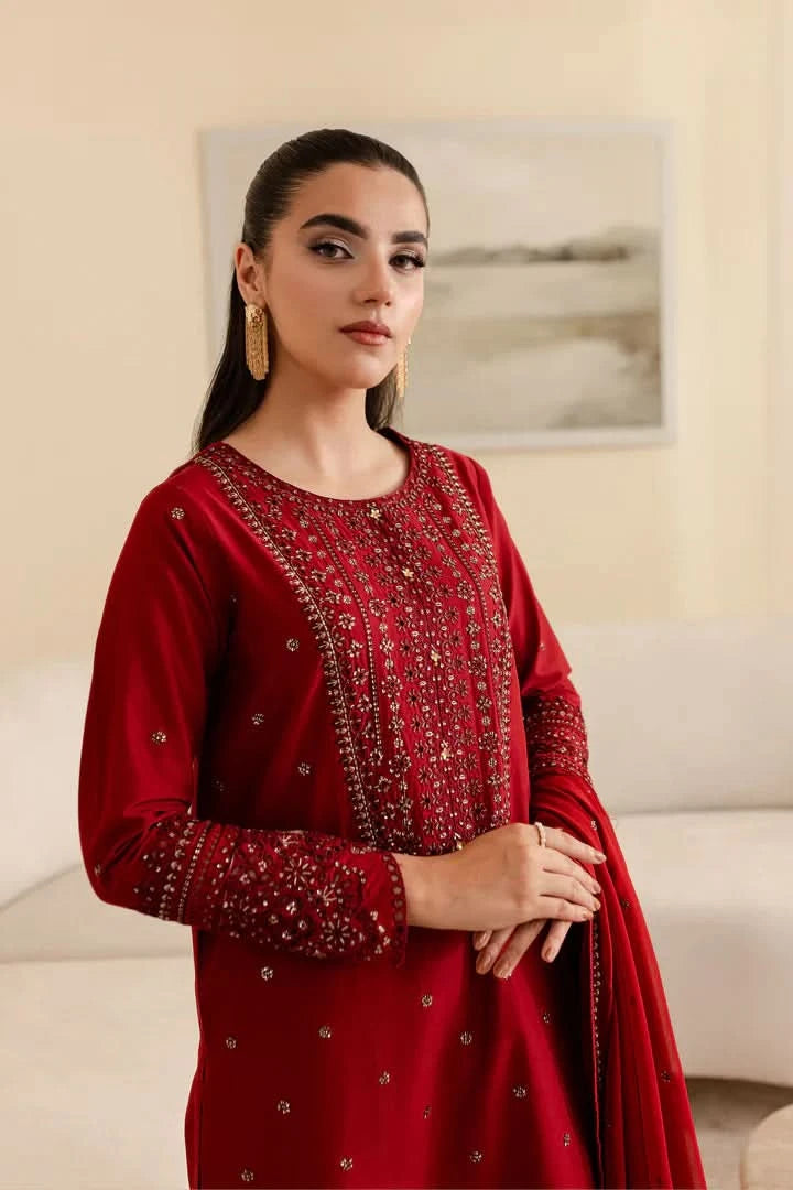 This suit includes: 1 embroidered front for shirt, 1 embroidered lace for front daman, 1 embroidered piece for both sleeves, 1 plain dyed back, 1 plain dyed trouser, 1 four sided embroidered duppata